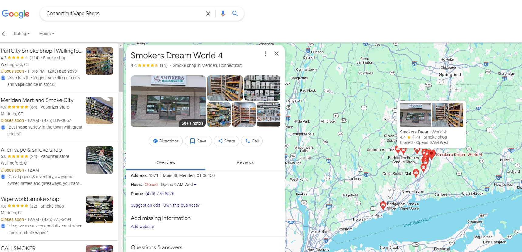 Clicking on the marker will display detailed information about the vape shop, such as reviews, address, business hours, website, phone number, etc. These stores will also be listed below the map. Some vape shops near you also appear in the list.