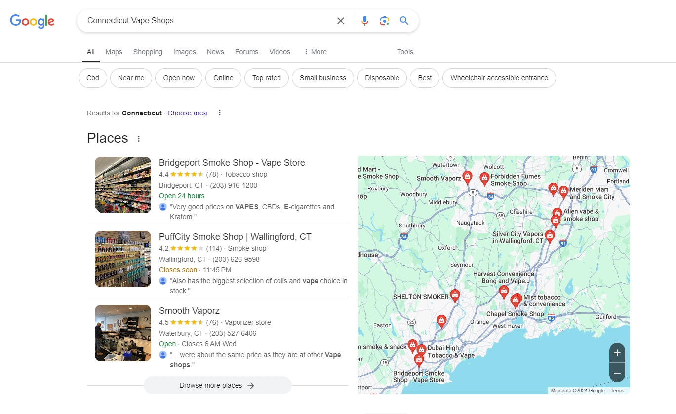Search directly on the Google search engine for your “region” “state” + “vape shop” to see nearby shops. You can click to enter the small map to view the specific location and your distance.